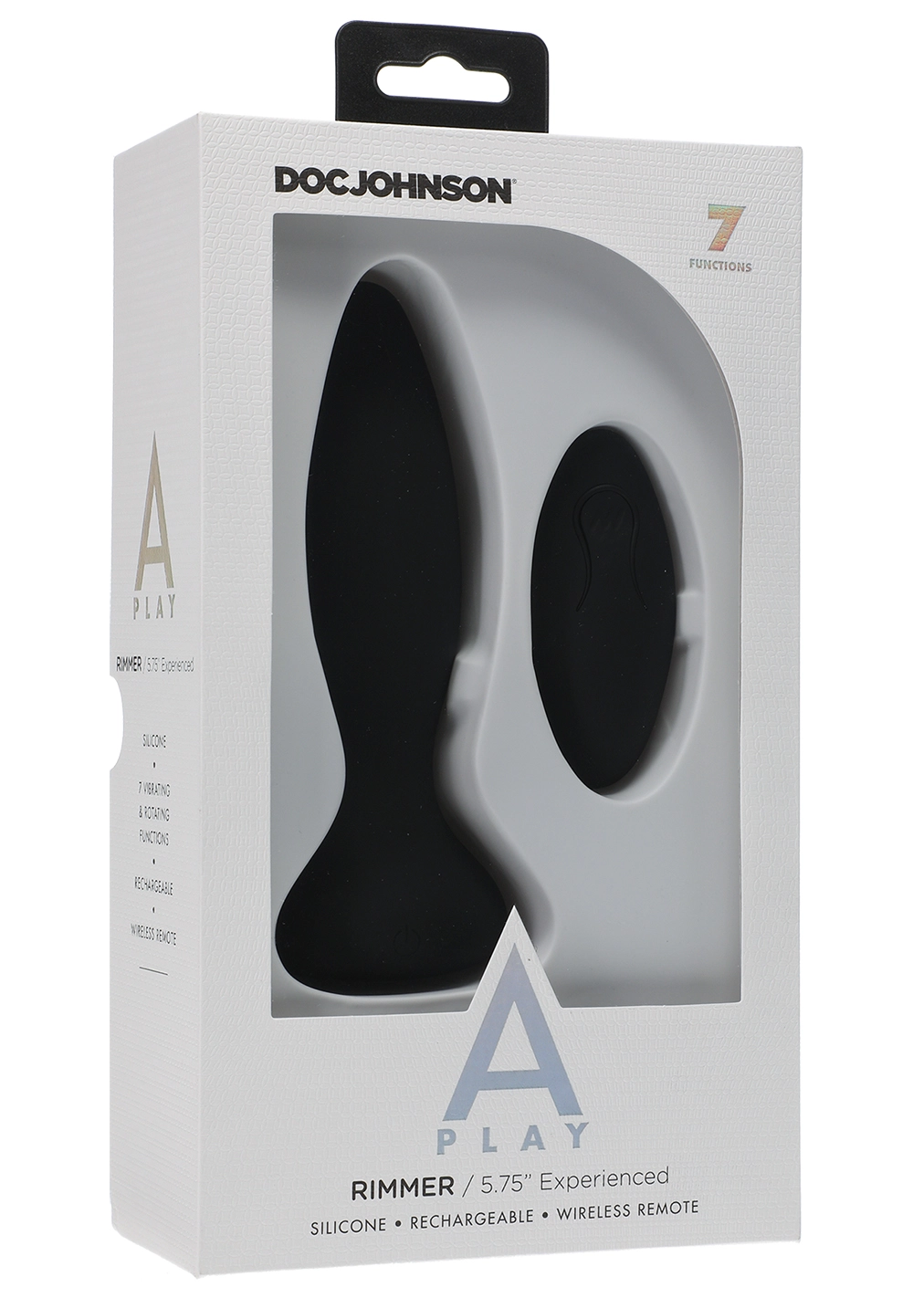 The 7-function Rimmer’s large size delivers the perfect feeling of fullness, and combines 2 stimulating features to give users the ultimate back door pleasure. The insertable section vibrates as powerful spinning ridges along the stem tease and massage the sensitive anal entry point. The Rimmer is conveniently controlled directly on the product or via the included wireless remote. A-Play is Doc Johnsonâs high-end line of performance anal plugs, created with a variety of sizes and special features to promote anal pleasure and exploration for users of every experience level. Each product in the A-Play collection is USB-rechargeable, water-resistant, and includes a charging cable and fabric storage bag.