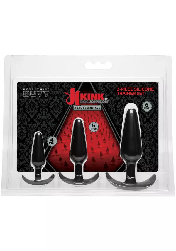 This set includes 3 velvet-touch silicone butt plugs in gradually increasing sizes for introducing anal play, or preparing for penetration with a partnerâs body or larger toys. The 4, 5, and 6 inch plugs are shaped with a slim tip for easy insertion and widen to create the ideal feeling of fullness at each stage. A unique curved base design follows the contours of the body for safety and comfort during extended backdoor play. Kink by Doc Johnson is an exciting collaboration with Kink.com to create a collection of high-quality authentic fetish items suitable for long-term practitioners and new initiates alike.