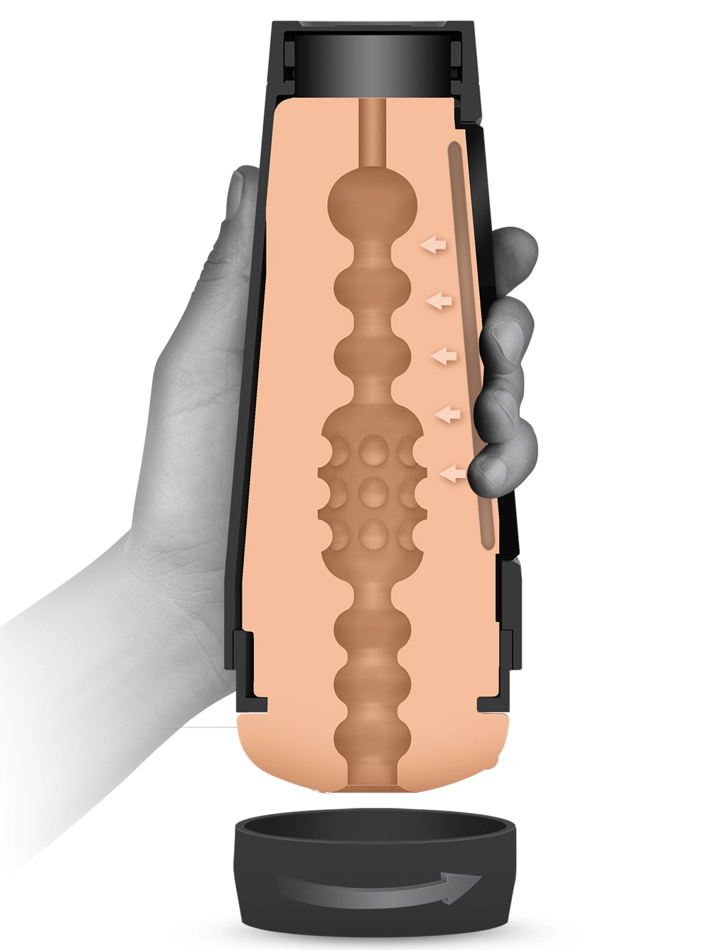 Your new main squeeze is here! Main Squeeze penis stimulator sleeves are styled with an ultra-realistic vulva opening made of Doc Johnsonâs soft, realistic, and hypoallergenic ULTRASKYN⢠material. Encased in a sleek, black hard shell, these hard case masturbators feature a squeezable grip that lets the user control the degree of tightness during use. Each squeeze brings additional pressure on the exquisitely textured internal canal that grinds along the shaft–and comes pretty darn close to simulating the pleasures of intercourse! Try soaking the removable sleeve in warm water, then slicking it with water-based lubricant, for a more life-like sensation. Slide a vibrating bullet into the hole at the base and send shivers of vibration throughout the entire tunnel! Plus you can remove the end cap to control the amount of suction you can feel during Main Squeeze penetration–with a noticeable difference in pressure when the cap is on versus off, youâll want to experiment all night long. Main Squeeze sleeves can also function as stamina training tools; by slowing the intensity of strokes, you can learn to last longer, if you wish.