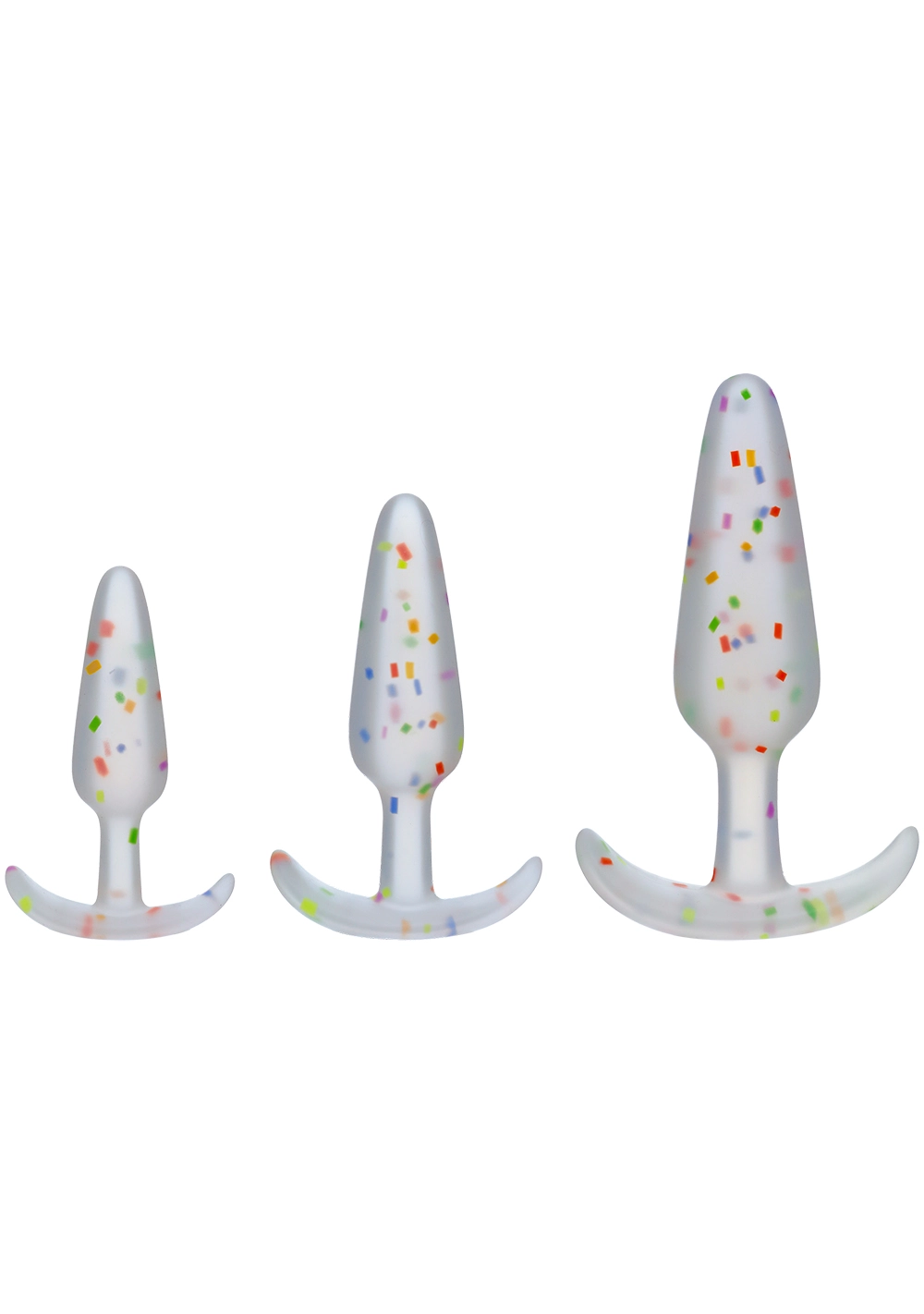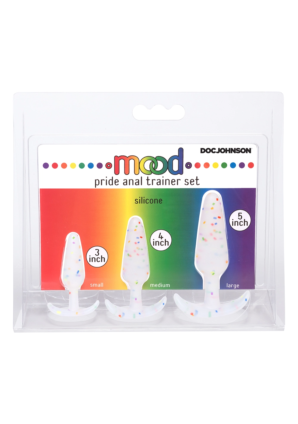 The Mood Naughty 1 Trainer Set in premium silicone is now available in rainbow confetti. This pack includes the best-selling Mood Naughty butt plug in three sizes: 3, 4, and 5 inches. This colorful set is perfectly shaped and sized to gently expand the boundaries of one’s anal experience. The classic tapered tip of Mood Naughty slides right in, and the firm-yet-flexible material and curved rocker base make these plugs comfortable and safe for extended wear.